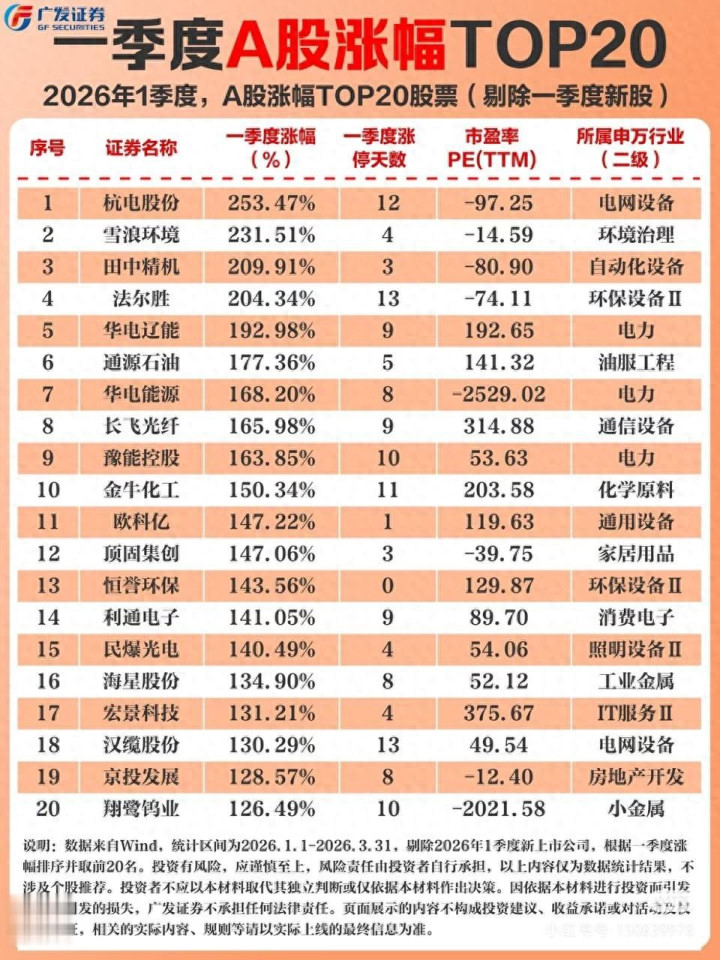 2026年一季度A股收官,有人亏到怀疑人生,有人却直接躺赢翻倍!广发证券这份**「一季度涨幅TOP20」** 就是最真实的“造富成绩单”: